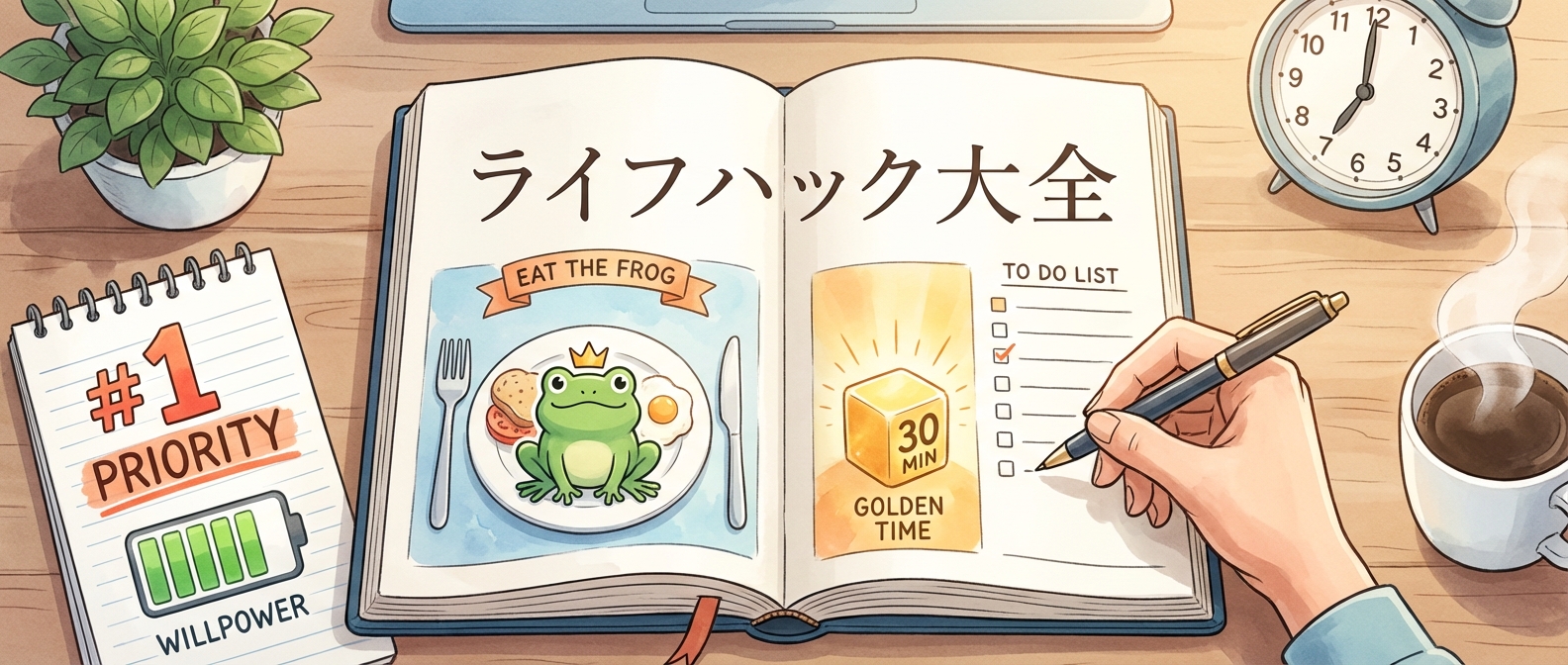 カエルを朝一番に食べる習慣、音声入力で移動時間を活用する習慣、30日チャレンジで自分をアップデートし続ける習慣——どれか一つを今日から試すだけで、半年後のあなたは確実に変わっています。GTD(Getting Things Done)で思考を外部化し、情報ダイエットで本当に大切なものだけに集中し、自動化への投資で繰り返し作業から解放される——一つひとつのハックが積み重なって、人生の航路はゆるやかに、しかし確実に書き換えられていきます。